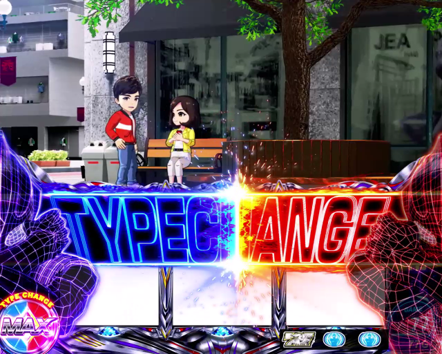 タイプチェンジゾーンは液晶左下にあるポイントがMAX(1枚役×12回)になると10G間だけリプレイ揃いを弱チェリー or 強チェリーに変換してくれるのですが、赤のパワータイプが選択されると全て強チェリーになるので、ティガチャンス当選に期待できます。