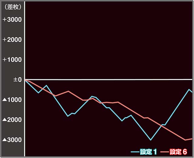 設定推測要素の解説に移る前に今回の実戦のスランプグラフをご覧ください。本機のポテンシャルを発揮できたのは設定1の実戦データ!