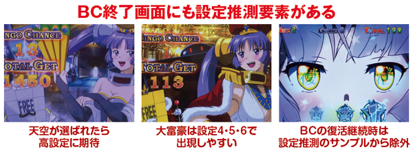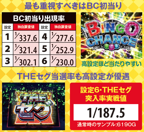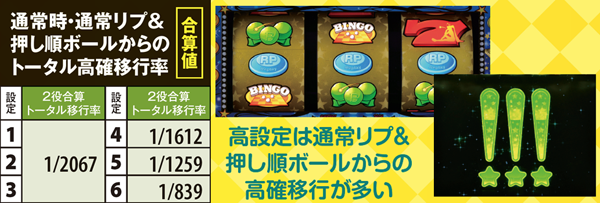 BC初当りが中間設定の値をウロウロしているようなら他の要素もチェック。「通常時の通常リプレイ&押し順ボール(ハズレ目)からの高確移行率」は設定差が大きいが、短い高確が選ばれると高確移行に気付けないこともあるので注意。