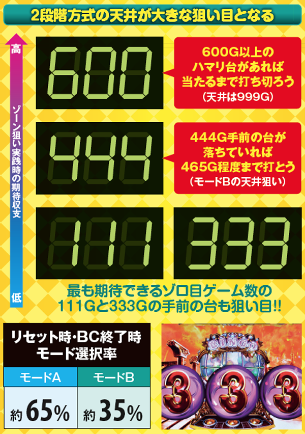 狙い目は大別すると「天井」と「ゾロ目ゲーム数」に分けることができるが、期待値が高いのは天井狙い。600G以上のハマリ台が落ちていることはなかなかないと思われるが、444G付近の台は気付かれず落ちている可能性も高い。