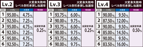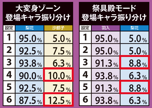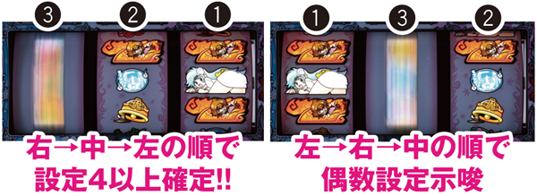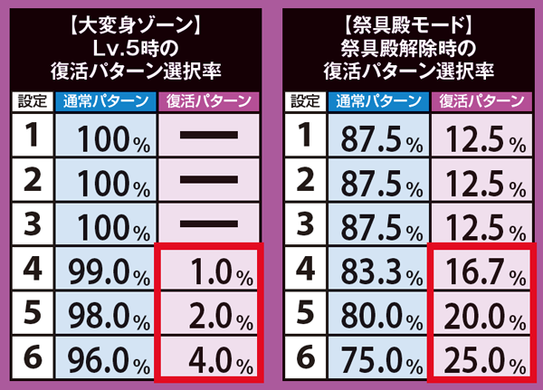 注目すべきは大変身ゾーンでLv.5になったのにもかかわらず失敗→復活パターンとなった場合。これが確認できれば、その時点で設定4以上が確定する。対する祭具殿モードでの復活パターンは高設定ほど発生率が高まる仕組みだ。この他、大変身ゾーンの難易度低で成功した場合の2Lv.アップや各CZのキャラなど奇数・偶数設定示唆要素も盛り込まれている。