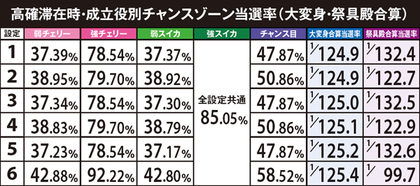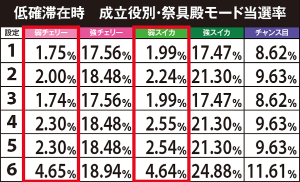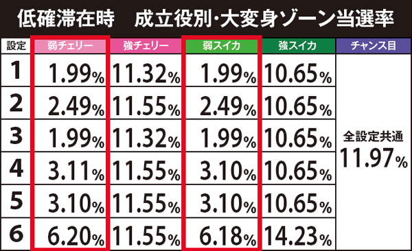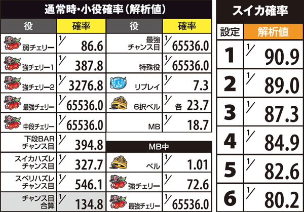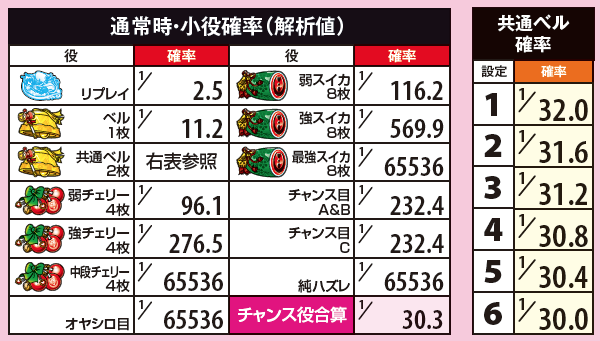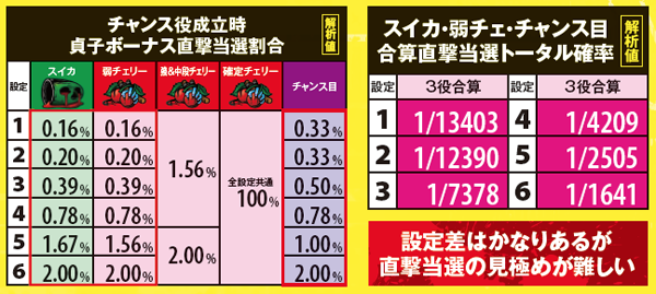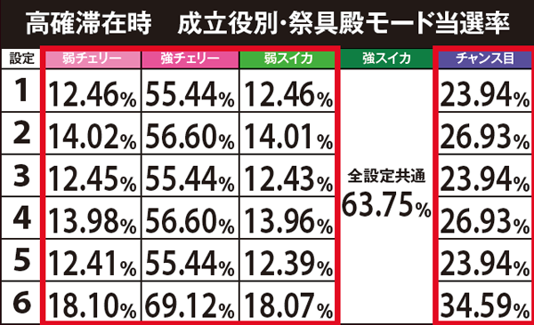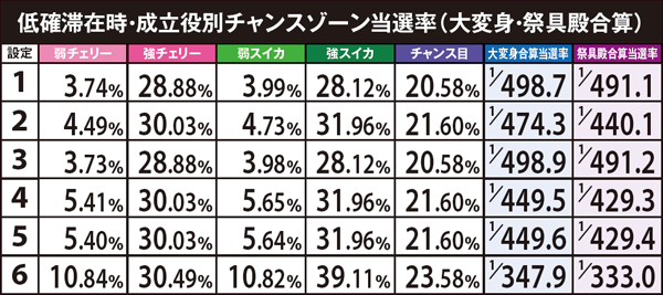 低確、高確を問わず比較的偶数設定は優遇されているのだが、設定6のみズバ抜けて当選しやすいことが分かるだろう。低確滞在時は弱役からの当選率に気を配りながら打ち進めたい。