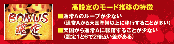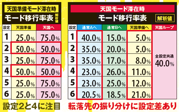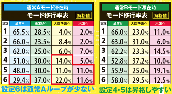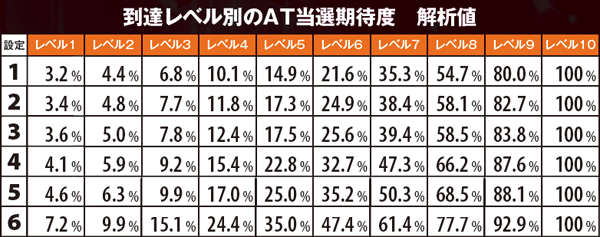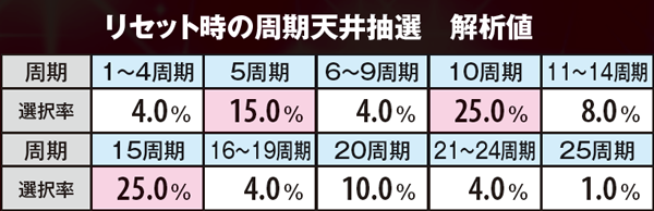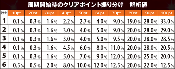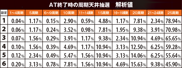 周期天井はリセット時とAT終了時で振り分けが異なり、リセット時は設定不問で天井が浅くなる。AT終了時は設定に左右され、高設定ほど天井が浅い。AT確定となるクリアポイントにも設定差があり、特に設定6は少なめで当たりやすくなっている。