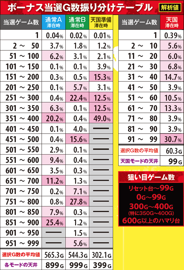 通常Bのチャンスゾーンである250~300Gも狙い目の一つ。ただし天国から抜けた直後と思われる台などは通常Bの可能性が低いので、滞在モードも考慮して攻めたい。