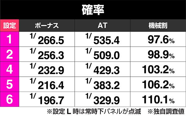 実質的な設定は5段階。ボーナス確率・AT初当り確率ともにかなりの設定差があるので、どちらも気にしておこう。