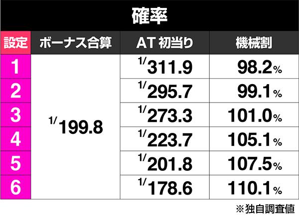 まずは簡易スペック表をご覧いただこう。ボーナス確率はなんと全設定共通。