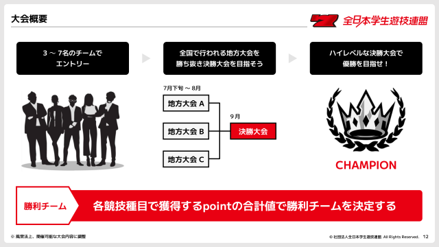 全国で地方大会を開催し、そこを勝ち抜いたチームが全国大会で優勝を争う大会なんですね。優勝すれば奨学金最大777万円進呈というご褒美が!