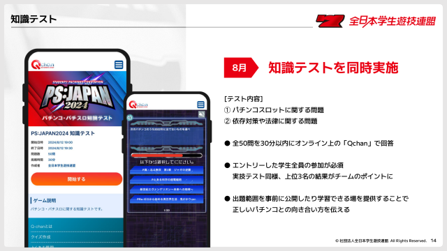 実技テストと並行して、8月にはエントリーメンバー全員参加のオンライン知識テストも実施。出題範囲を事前に告知したり学習できる場を提供したりすることで、正しいパチンコとの向き合い方が学べる内容になっています。