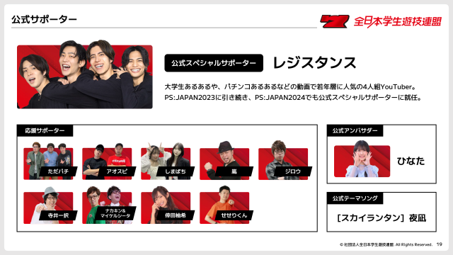 公式サポーターは昨年に引き続き、4人組YouTuberのレジスタンス。VTRでの応援メッセージを届けてくれました。当日記者会見に駆けつけてくれたアオスピ・ただパチ・しまぱちを始めとする応援サポーターと一緒に、大会を盛り上げてくれそうです。