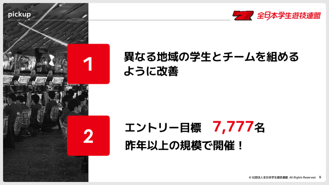 地域に縛られすぎないチーム編成を可能にすることで、参加ハードルを下げるそうです。そして、エントリー目標は7,777名に設定! うん、なんともパチンコ・パチスロ好きが考えそうな数値設定で素晴らしいですね。