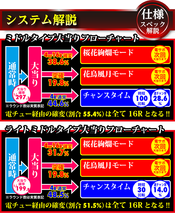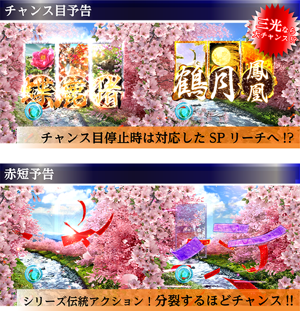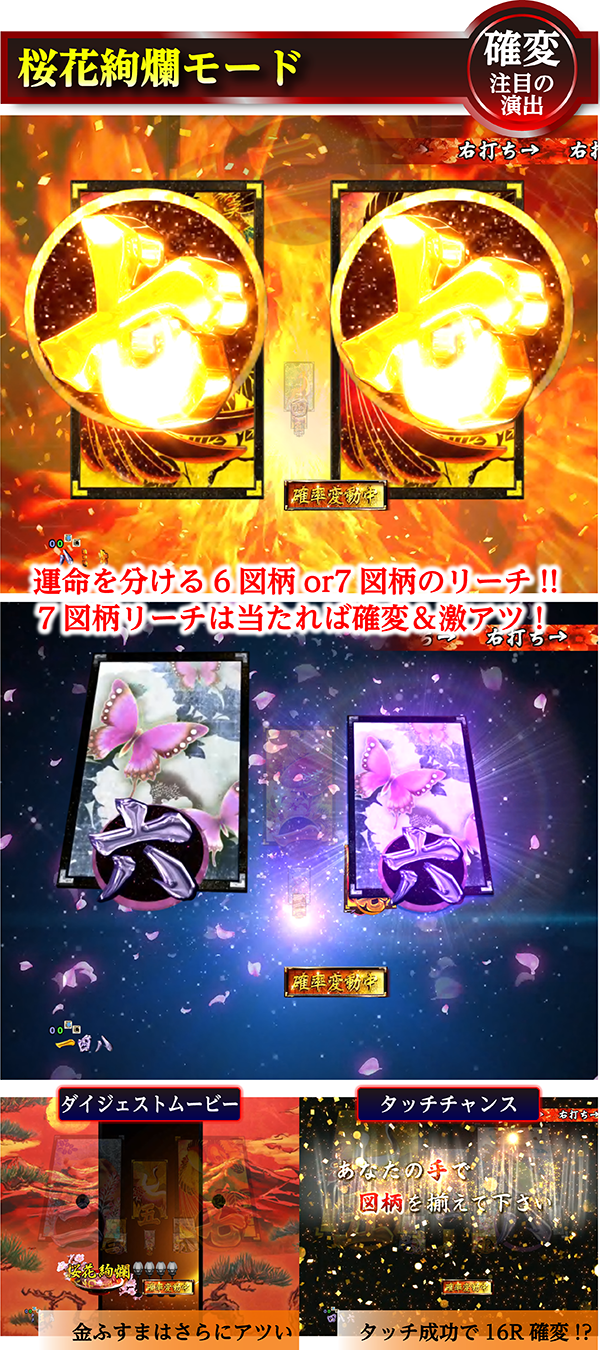 確変中は七図柄で当たれば16R確変濃厚。六図柄揃いは主に巡り会い演出に発展し、演出に失敗すると4R通常となる。特殊発展となるタッチチャンスも成功すれば確変だ。また、ダイジェストムービーや保留変化の緑や赤など、当たれば確変となるパターンも多数搭載。これらの演出が発生した場合は大当りに期待しよう! チャンスタイム中と桜花絢爛モード中限定で発生する真花月全回転も一見の価値ありだ。