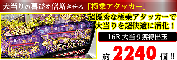 また、電サポ中(電チュー経由)の確変大当りはすべて16Rと連チャン時の喜びも倍増。さらに16R・15個賞球・10カウントという現行機種最高の払い出しに加え、こぼしの少ない「極乗アタッカー」を搭載しているため、一撃約2240個という大量出玉を獲得することが可能だ。