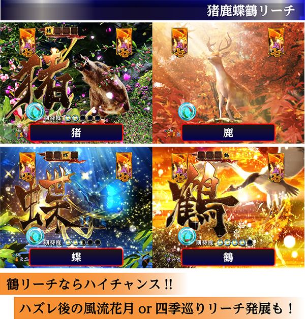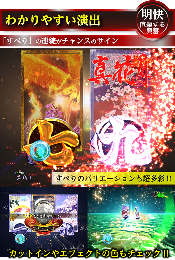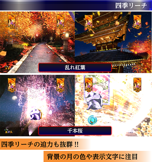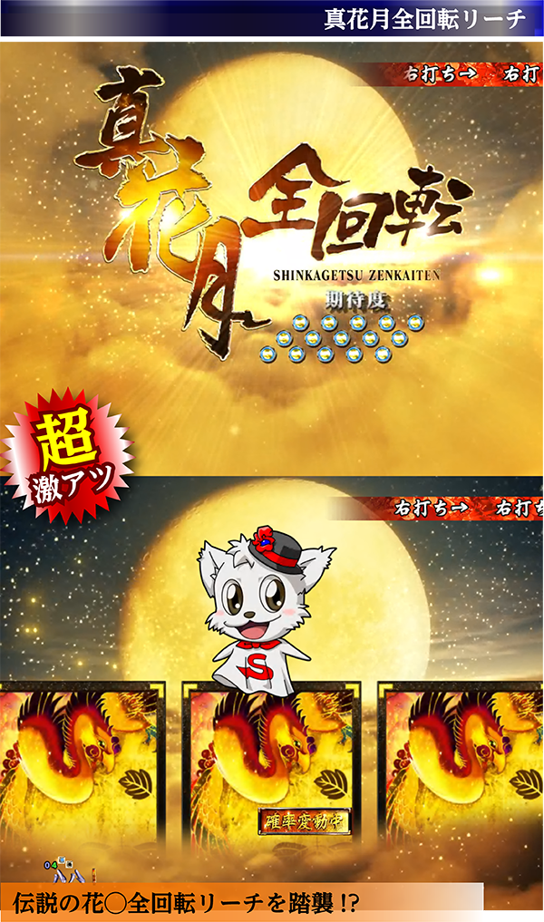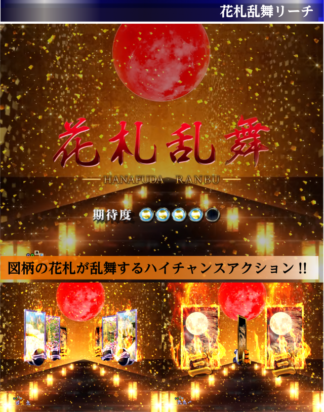リーチ中のチャンスアップは赤い月や「真花月」文字出現などわかりやすくなっているため、初見でもアツさを把握しやすい作りとなっている。
