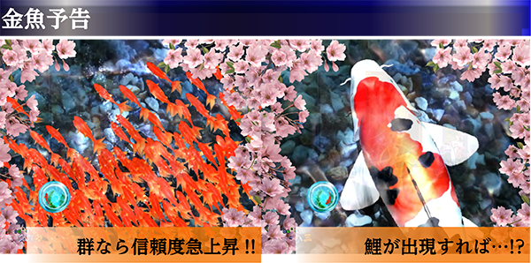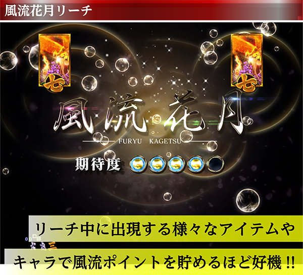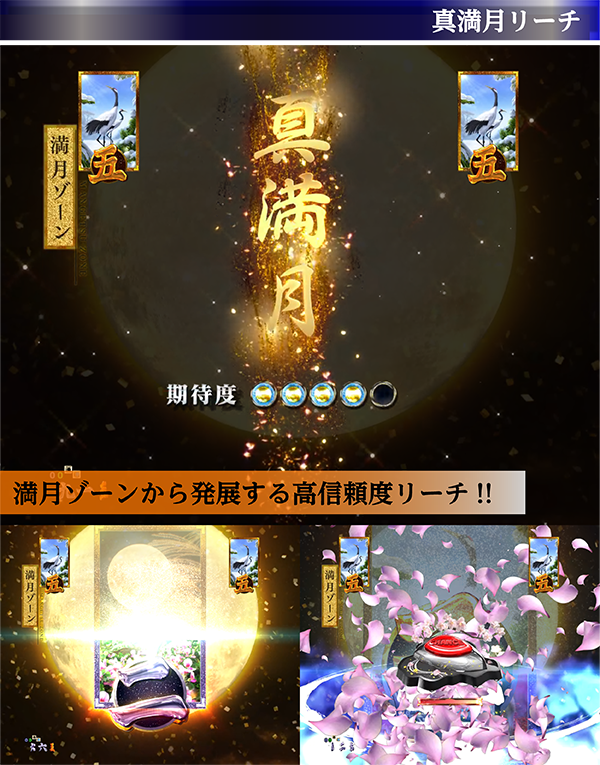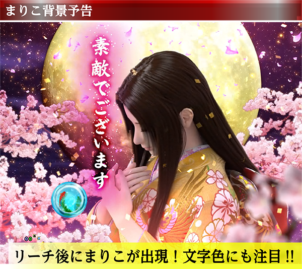 満月ゾーンはリーチが成立すれば激アツ、まりこ背景は発生した時点で期待大だが、文字が金色ならさらに信頼度アップ。風流花月リーチはリーチ中に出現するアイテムなどでポイントをためるほど信頼度アップ。金エフェクトのアイテムが出現すれば激アツとなる。