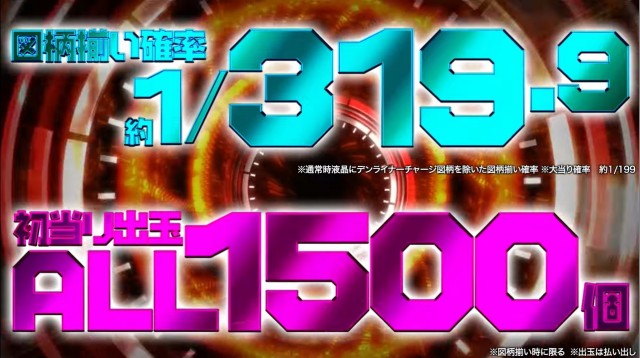 仮面ライダーシリーズ最新作にして平成ライダー初のパチンコ化となる本機は、大当り確率(図柄揃い確率)約1/319.9、初当りの出玉は全て1500個の払い出しを得られるミドルスペックで登場。