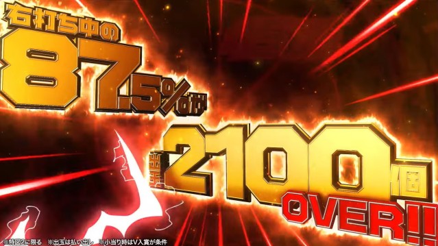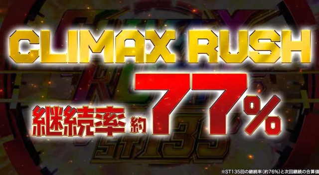 このラッキートリガー「CLIMAX RUSH」は135回転のSTで継続率が約77%。肝心の出玉については大当りの87.5%が出玉2100~4500個となる模様だ。