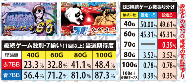 本機の設定推測は難易度の高い部類に入るのでリセット状況なども加味しつつ挑みたい。BC終了画面の天空や大富豪はプラス要素だが、BCが復活継続した場合はサンプルから除外しよう。