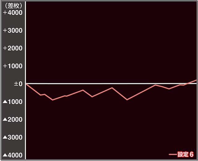 今回は設定6を1台実戦し、結果は気持ち程度のプラス。実戦時に宿命を大量に獲得できる「宿命超バースト」に突入したことで、初当り確率が公表値よりもかなり上振れしましたが、設定6でもここまで緩やかなグラフを描かないと思います。
