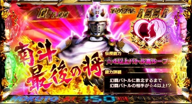 また、ユリアポイント契機でのユリアボーナス当選時のみ、伝授キャラ「南斗最後の将」の獲得抽選が追加で行われています。ユリアボーナス直撃時よりも期待値が高いのでハマっている台や連続で駆け抜けしている台は狙い目!
