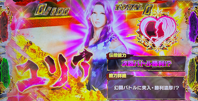 なお、ユリアボーナス当選時は伝授キャラ「ユリア」を獲得する事ができ、ユリアの能力が「宿星バトル(※1)+バトル勝利濃厚」となります。つまり初回の幻闘ラッシュは突破確定となるので、ユリアボーナス当選時は通常の初当りよりも期待値が高く、これが機械割に影響している1つの要素になると思われます。