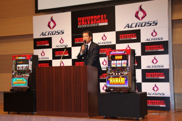また、ユーザーニーズの「遊べる」というキーワードに対する取り組みとして、2015年にACROSSブランドから『SUPER JACKPOT』と『ハナビ』の2機種を発表すると説明。