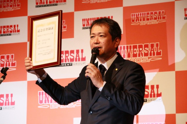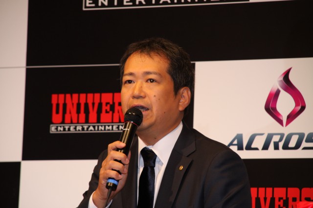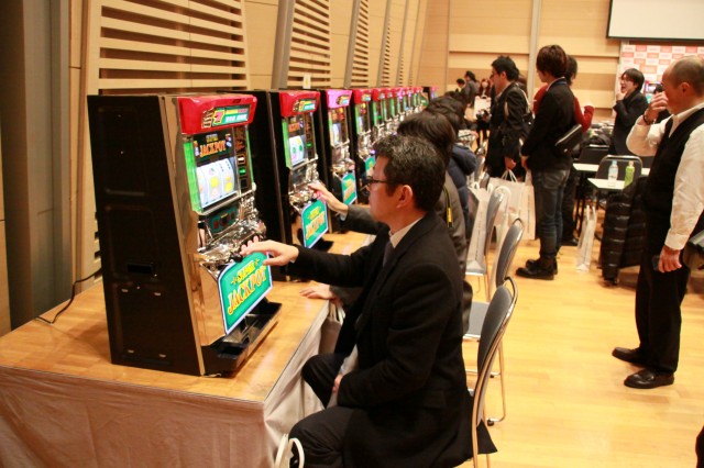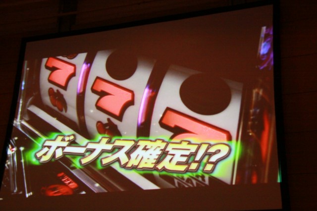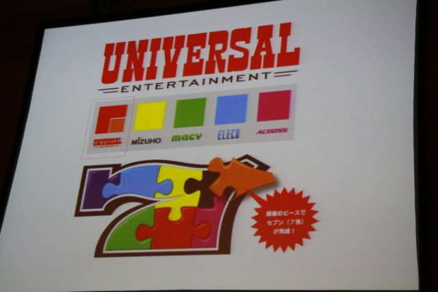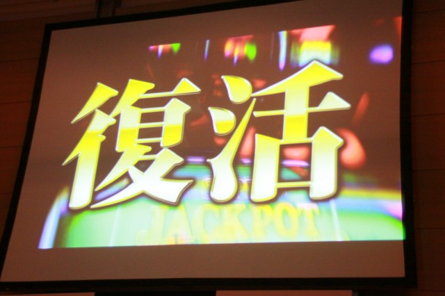 「所謂「後告知」市場に正面からぶつかっていき、数年後には『SUPER JACKPOT』がスタンダードになると思っている」と岡崎産業・ユニバーサルエンターテインメント両社のコラボ第一弾機種としての自信を語った。