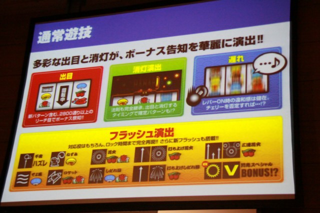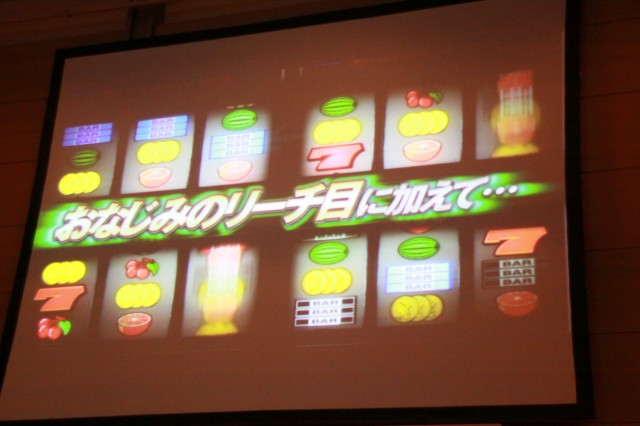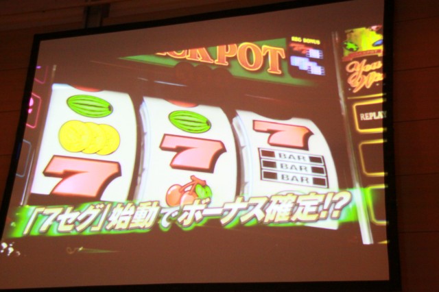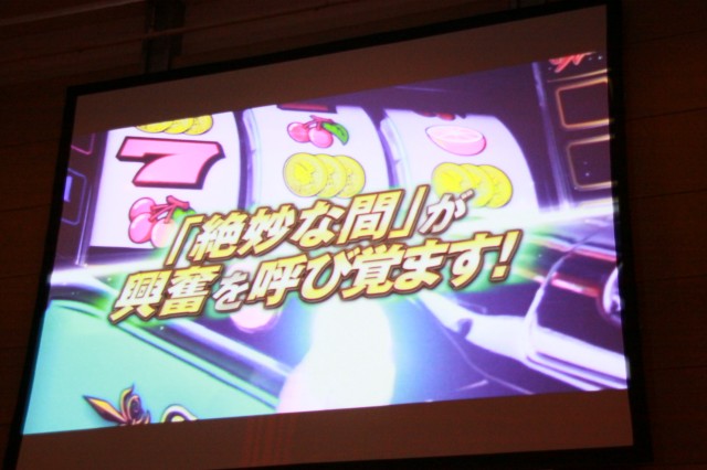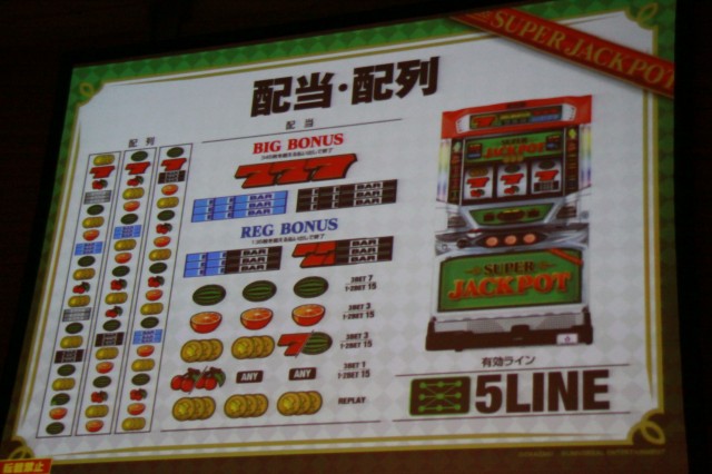 続いて機種説明はマーケット戦略室山本学課長が登壇。『SUPER JACKPOT』のPVに引き続き、同機の機種説明に入った。