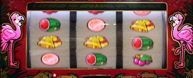 通常時はフラミンゴが点滅すればボーナスかつボーナス当選契機はリーチ目役(15枚役)のみという超シンプル仕様で登場した『バハマ』(アムテックス)。