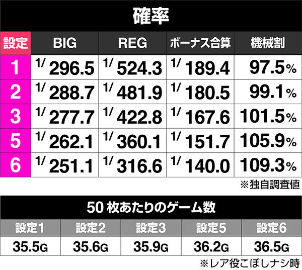 ボーナス終了後1G目でも1000G目でもボーナス当選確率は同じで、ハマっているほど当たりやすくなるといったこともない(そのため狙い目も存在しない)。いかなる時でも設定に準じた確率で大当りが抽選されている。