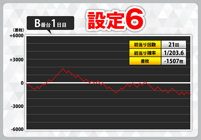例えば、3日目B番台(設定1)、6日目B番台(設定2)のように約6000枚のマイナスや、2日目のD番台(設定1)のように、本当に何も起きないまま、あわや逆万枚となってしまうことも…。