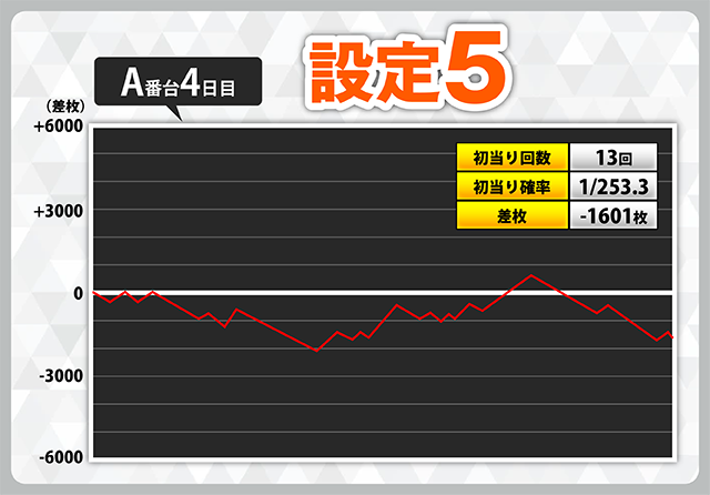 また、出ている台は一撃が伸びている印象のため、たとえ高設定であってもAT中に何もできないと、7日目のC番台(設定5)のように、初当りがかなり取れているのに、約3000枚のマイナスとなってしまうといった危険性も秘めています。