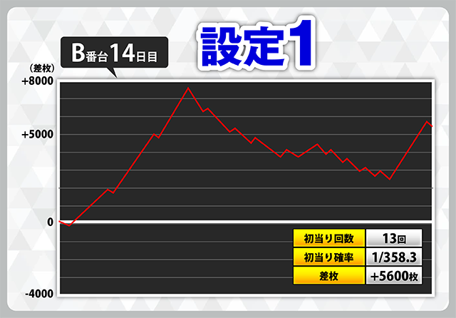 11日目のB番台、12日目のC番台で7500枚以上のプラス、14日目のB番台で5600枚、12日目のE番台で4000枚のプラスとなっていて、驚くことにこれらすべてが設定1での結果になっています。