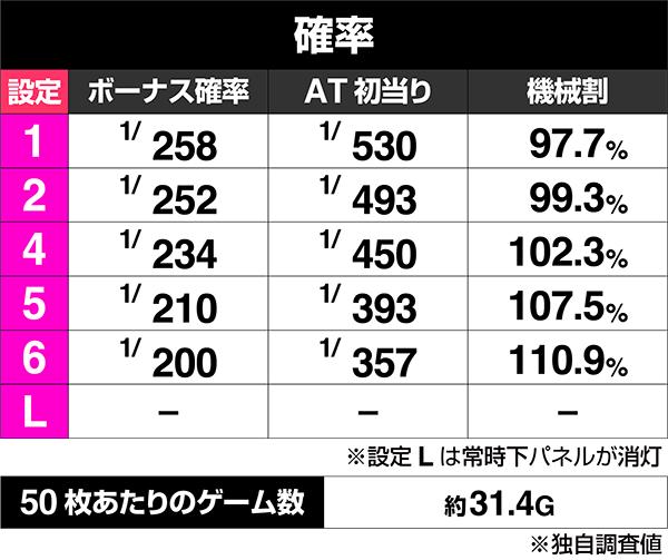 本機は実質5段階設定。昨今の機種と比較して設定6の機械割はそれほど高くないが、その一方でATの初当り確率にはそこそこの格差が設けられている。