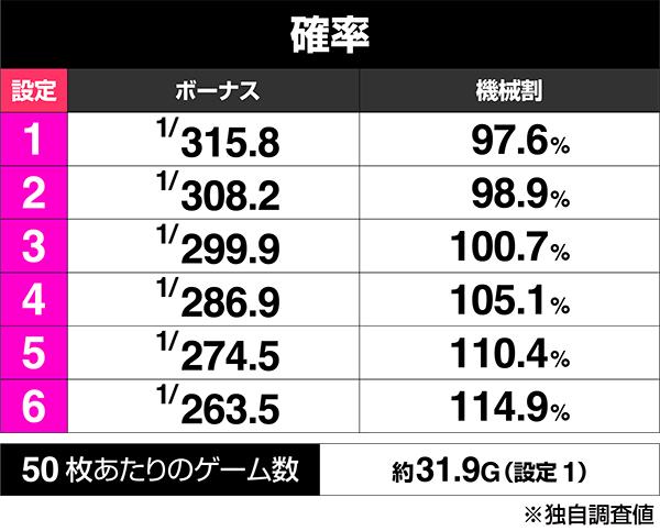 AT突入契機となるボーナスの初当り確率は上の表の通り。そこまでの設定差はないが、高設定の目安は1/290以上といったところだろう。