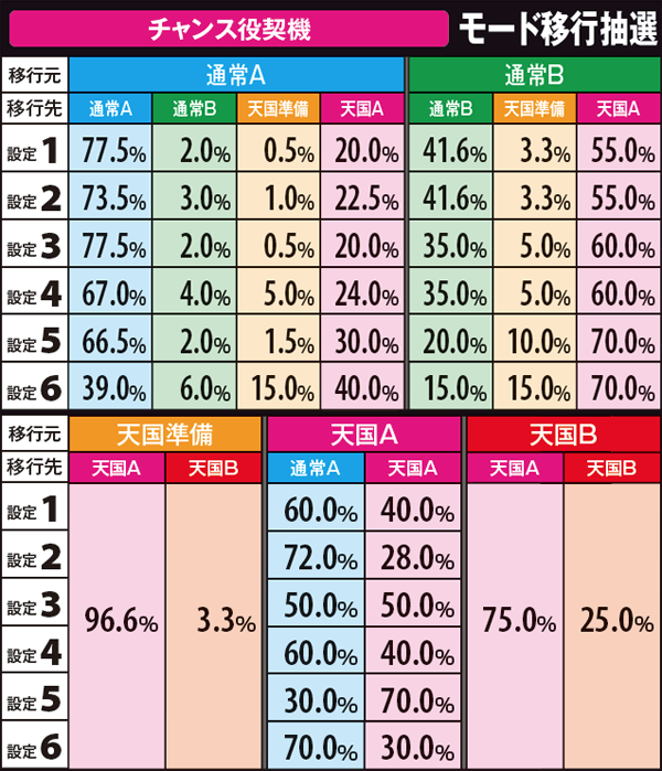 天国への移行率が最も高いのは設定6で、以下設定4、設定5の順となる。設定6の天国移行率が群を抜いて高いのが特徴だが、ループ率については低く、最もループしやすいのは設定5となっている。よって、天国滞在が正確に見極められれば設定推測は簡単なのだが…実際は天国以外でも96G以内に当たるケースもあるため、ここでの判断ミスが推測設定を大きく見誤らせることも。