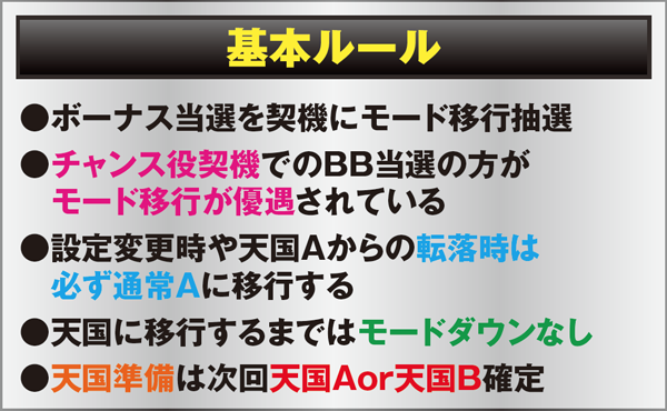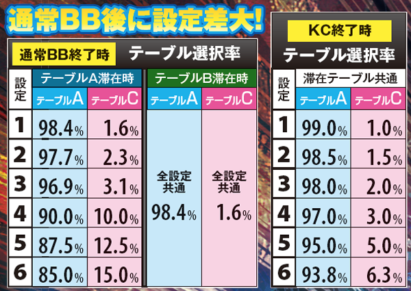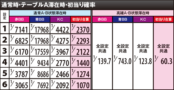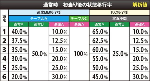 テーブル移行抽選が行われるのは通常BBorKC終了時。ここで大半はテーブルAが選ばれるようになっており、いわゆる天国モードに該当するテーブルCは高設定になるほど選択率が高くなる。なお、テーブルC中はボーナスを抽選しておらず、チャンス役での当選でも必ずKCに当選する。