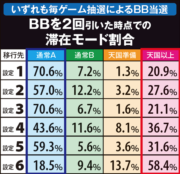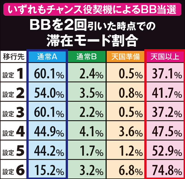 基本となる通常Aからの天国移行を考えた場合、設定6の「天国への上がりやすさ」は際立っている。仮に毎ゲーム抽選での当選が続いたとしても、2回当選時点での天国移行率は58.4%。チャンス役契機で3回当選なら天国は89.9%。つまり、BBを2~3回ほど引いて天国に上がらないようなら、その台は設定6の可能性大幅ダウンと考えてOK。リセット時は通常A確定なので、朝イチは「2or3回ボーナスを引くまでに天国に移行するか」が6見極めの重要ポイントとなる。