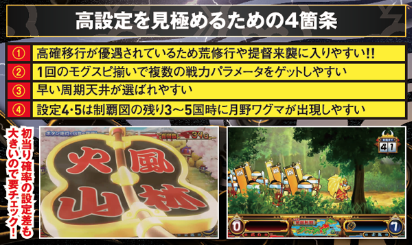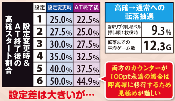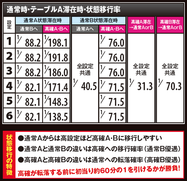 チャンス役で内部状態を通常A→通常B→高確と段階的に昇格させ、転落する前に初当りを射止めるのが本機の王道パターン。それゆえ、状態移行率は高設定ほど優遇されているが、高確滞在中の初当り確率に設定差はない。