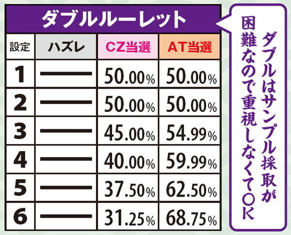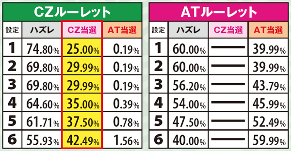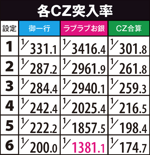 いずれのルーレットにも設定差が存在するが、サンプル採取の容易なCZルーレットを軸に押し退きを判断したい。CZ当選率が35%以上であるようなら高設定の期待大だ。また、高設定ほど優遇されているラブラブお銀デート突入率もチェック!