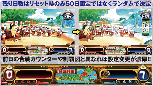 リセット時は合戦カウンター・制覇図・戦力パラメータが再抽選されるため、前日閉店時と変化していた場合はリセットが濃厚。