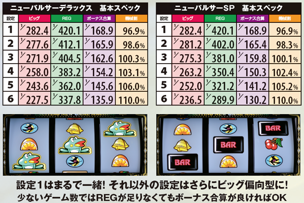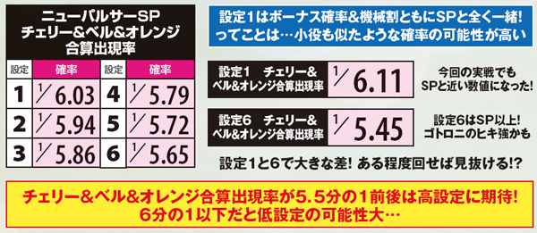 設定1のボーナス確率・機械割はともにSPと完全に一緒。よって小役合算も6.03分の1に近い数値である可能性が高い。今回の実戦でも設定1は6.11分の1だったが、設定6は5.45分の1と出現率に大きな差があった。通常時はSPの小役出現率を参考にして立ち回って問題ないだろう。