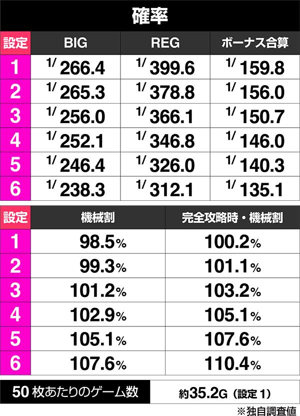 | 設定 | BIG確率 | REG確率 | ボーナス 合算確率 |