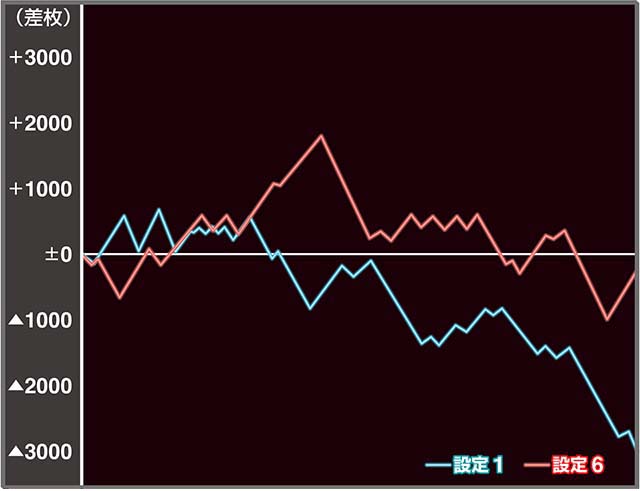 設定6も序盤から中盤にかけてはプラス域だったので、マイナスになっているとはいえ悪くない挙動ですし、意外とグラフで設定の良し悪しが分かるやも知れません。