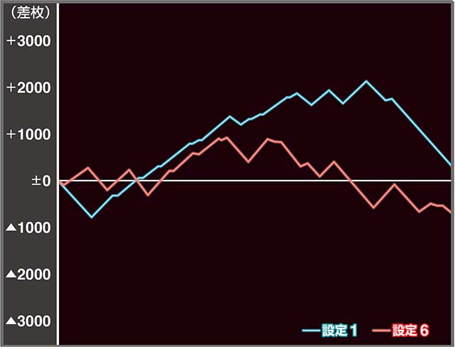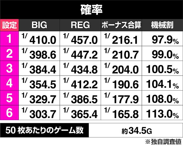 本機はオーソドックスな6段階設定となっていて、ボーナス確率にはしっかりとした差がついています。しかし、今回の実戦データは前述した通り、CZがまったく成功できずかなりヒキが弱かったと思われ、設定6のボーナス確率が、公表されている設定1を下回るといった結果になってしまいました。