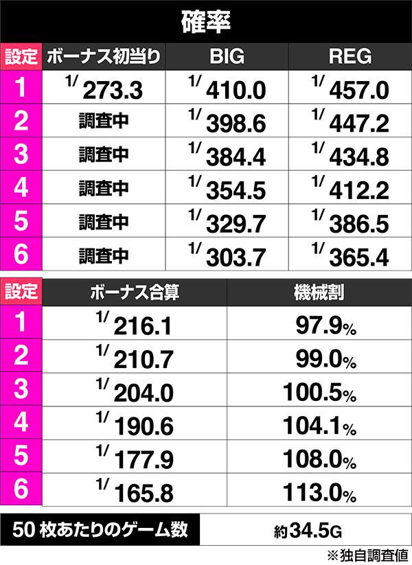 ボーナスで出玉を増やしていくので、当然ながらボーナス確率に設定差が存在。特徴的なのはBR比率だろう。若干ながらBIG寄りではあるものの、1対1に近い比率となっている。