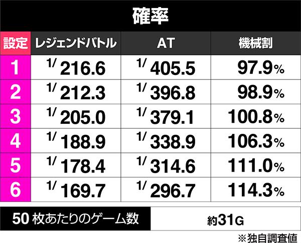 まずは簡易スペック表をご覧いただこう。レジェンドバトルもAT初当りも高設定ほど確率は高いので、難しく考えず“高設定ほど当たりやすい”という認識でOK。