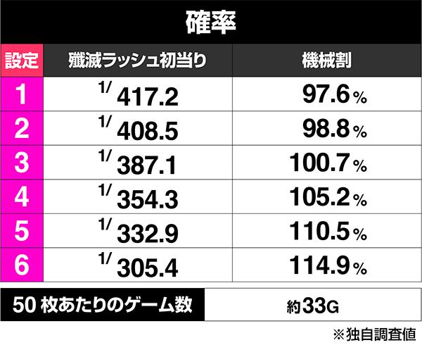 殲滅ラッシュは10G/セットかつ純増約9.0枚/GのATで、後述の大兎殲滅戦(引き戻しゾーン)をループさせてロング継続を目指すゲーム性。