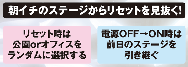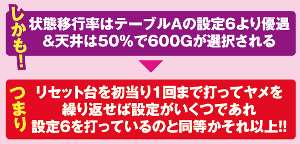 テーブルBの最大の恩恵は初当り確率の軽さにある。移行時にはテーブルA時の設定6と同じ確率で初当り抽選が行われるため、リセット台で初当りを1回取るまで打って移動を繰り返せば、設定6を打っているのと同等かそれ以上の出玉率となる。