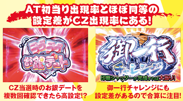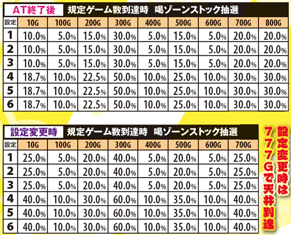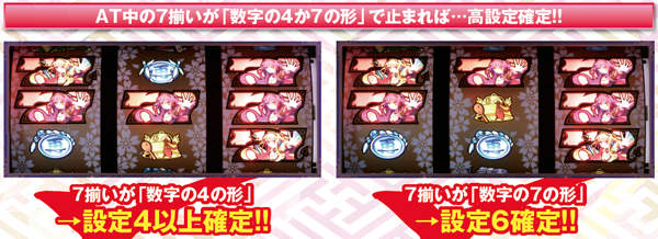 AT中にカットイン発生→7揃いを達成した場合は、次のバトルの勝利が確定する(ダブル揃いは3桁上乗せも確定)。この際、7揃いが「数字の4の形」となった場合は設定4以上が確定、「数字の7の形」であれば設定6確定となる。