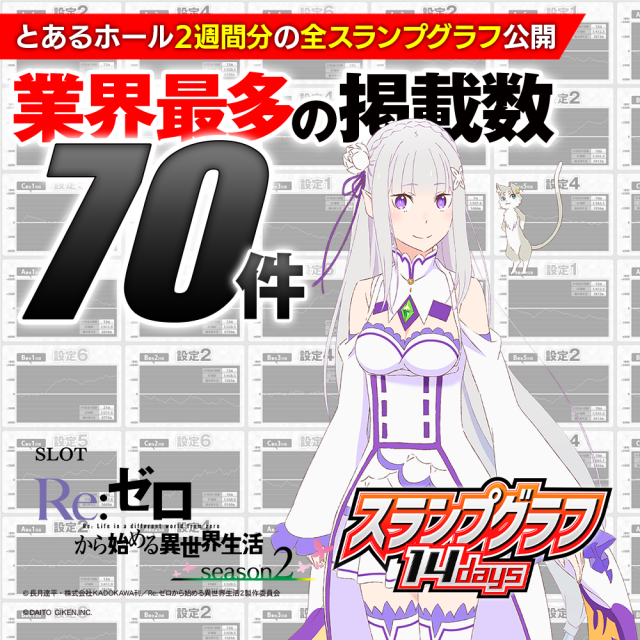 先週に引き続き、今回は『スロット Re:ゼロから始める異世界生活 season2』の導入2週間目のスランプグラフをいただきましたので、新たに35件分のスランプグラフを追加更新いたしました!